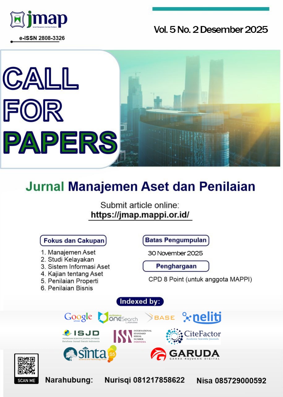 Bapak/Ibu Yang Kami Hormati, saat ini kami sedang mengembangkan Jurnal JMAP dengan scope bidang penilaian properti, penilaian bisnis, kajian, studi kelayakan, manajemen aset/properti, dan sistem informasi aset. Sangat diharapkan bapak/Ibu dapat berperan serta mengirimkan artikelnya untuk dipublikasikan di Jurnal JMAP Vol. 5 No. 2 (2025): Edisi Desember 2025.