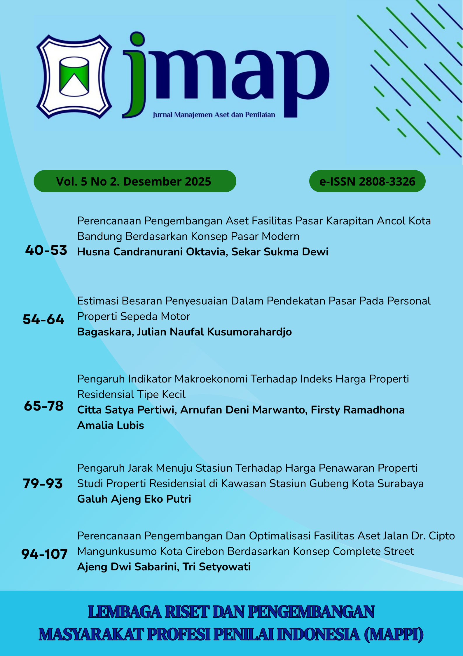 Jurnal Manajemen Aset dan Penilaian (JMAP) is an open access and peer-reviewed journal that aims to publish original research articles related to the fields of property valuation, business valuation, studies, feasibility studies, asset/property management, and asset information systems. This journal is also dedicated to publishing articles published for free to academics, researchers, practitioners, regulators, and the public.